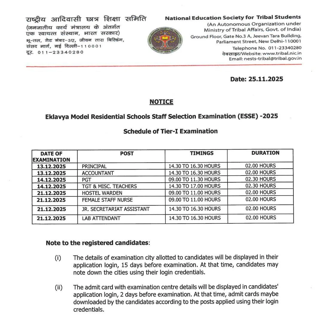 Eklavya Model Residential Schools (EMRS), Ministry of Tribal Affairs, will release the nests.tribal.gov.in EMRS Teaching & Non-Teaching Hall Ticket 2025 in December 2025 for EMRS Teaching & Non-Teaching Written Examination 2025. Follow these steps to check for the EMRS Teaching & Non-Teaching Exam City 2025 Download Link.
