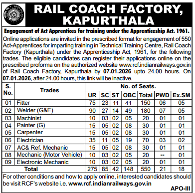 rcf.indianrailways.gov.in Rail Coach Factory (RCF) Kapurthala RCF Kapurthala Apprentice Recruitment 2025, Eligibility, Fee, Last Date, Apply Online, RCF Kapurthala Apprentice has released the new notification for the recruitment of Rail Coach Factory (RCF) Apprentice New Vacancy 2025, RCF Kapurthala Apprentice Online Registration Form 2025 for 550 Posts has started from 09 December 2025 to 07 January 2026. through the official website of the Authority. The candidates who are interested in RCF Kapurthala Apprentice Bharti 2025, kindly read the full notification related to Rail Coach Factory (RCF) Apprentice Jobs 2025, Like Eligibility, Application Fee, Age Limit, Salary, Selection Process and all other information. All the details related to the Railway Apprentices Online Registration Application Form 2025 Link are given below.