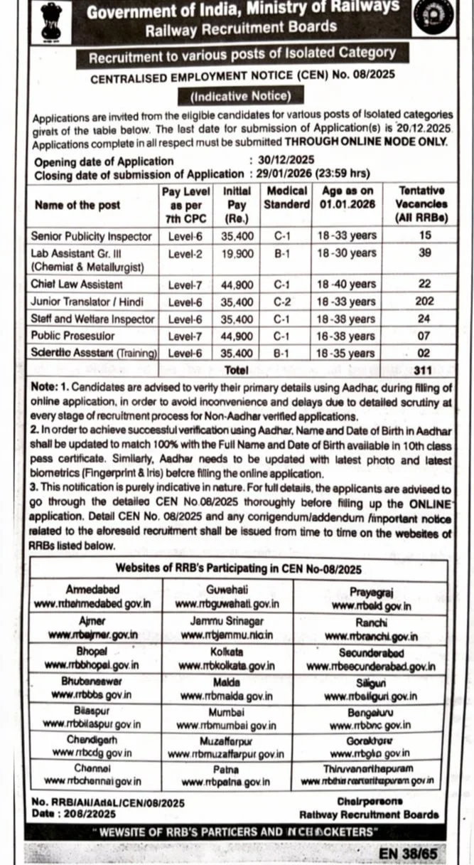 indianrailways.gov.in Railway Recruitment Boards (RRB) RRB Isolated Categories Recruitment 2026, Eligibility, Fee, Last Date, Apply Online, Authority has released the new notification for the recruitment of RRB Isolated Categories Senior Publicity Inspector, Lab Assistant Grade III (Chemist and Metallurgist), Chief Law Assistant, Junior Translator (Hindi), Staff and Welfare Inspector, Public Prosecutor and Scientific Assistant/ Training New Vacancy 2026 for 311 Posts, RRB Isolated Categories Online Registration Form 2026 will be started from 30 December 2025 to 29 January 2026 through the official website of the Authority. The candidates who are interested in RRB CEN 08/2025 Isolated Categories Bharti 2026, kindly read the full notification related to RRB Isolated Categories Jobs 2026. Check Eligibility, Application Fee, Age Limit, Salary, Selection Process, and all other information. All the details related to the RRB Isolated Categories Online Registration Application Form 2026 Link are given below.